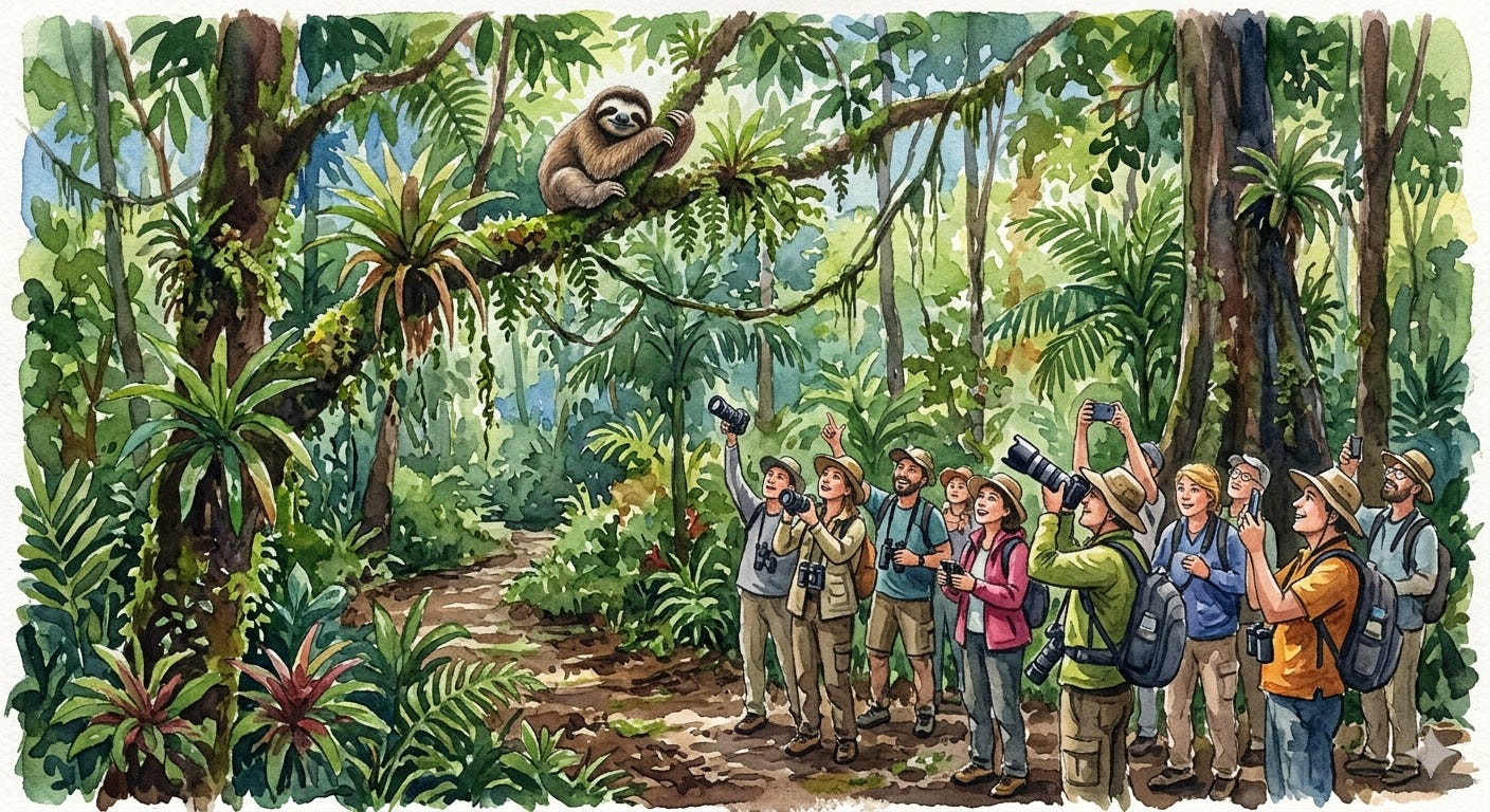 Sloth-spotting is the cornerstone of Costa Rican tourism. It occupies roughly the same cultural position as the Running of the Bulls in Pamplona, except the animal in question has not moved since Tuesday, and the only danger is pulled neck muscles from craning upward for forty-five minutes at what turns out to be a knot in a tree. When someone finally spots what may or may not be a sloth, the group falls into a collective delirium that is genuinely moving to witness. “Can you see it? Can you SEE it? Third branch from the right of THAT tree, not THAT tree, the other one, no, LEFT, your other left” — and then, as one, out come the Swarovski spotting scopes, the Leica binoculars, the Canon cameras fitted with lenses the size and apparent firepower of surface-to-air missiles. “I see it!” screams one triumphant participant, who is already mentally composing their Instagram caption and silently calculating the earliest possible flight home. During our last visit, I had to physically restrain myself from standing on a stump and announcing, “I have seen my sloth. My sloth has been seen. I am complete. I release you all.”